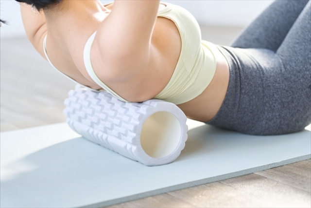 背骨に沿ってローラーを転がすと、自然と胸が開いて姿勢がまっすぐに。